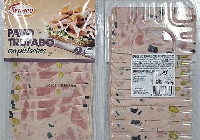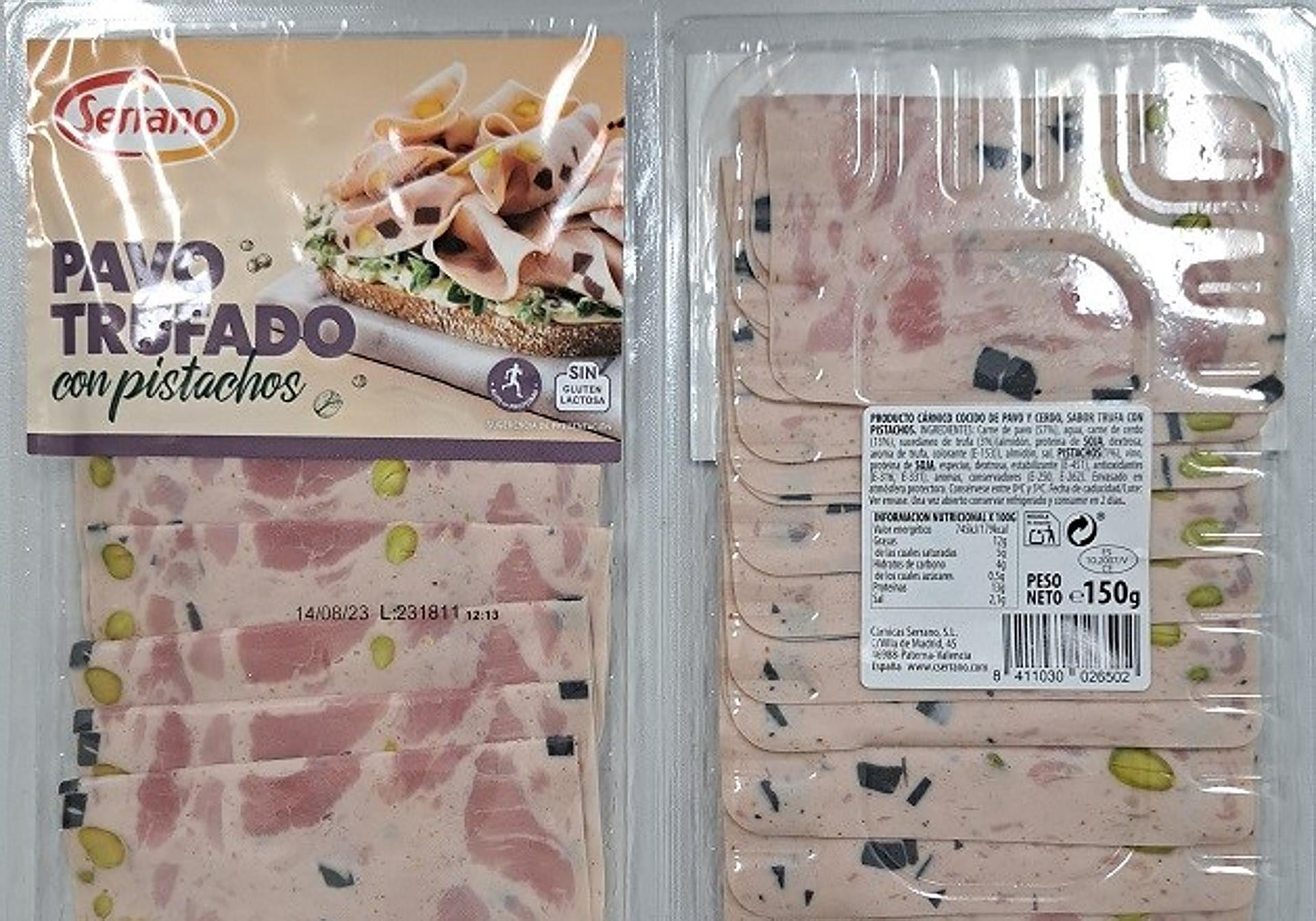 A través del Sistema Coordinado de Intercambio Rápido de Información (SCIRI), se ha tenido conocimiento de otros cuatro productos. Primero, el pavo trufado con pistachos de la marca Serrano envasado y loncheado, con el número de lote 252771 y fecha de caducidad 18/11/2025.