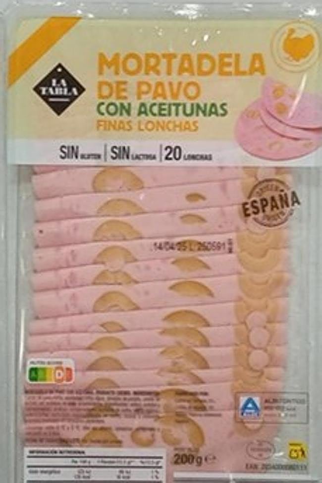 También la mortadela de pavo con aceitunas de la firma La Tabla. Envasado y locheado, su lote es el número 252761 y 252771, con fecha de caducidad 18/11/2025.