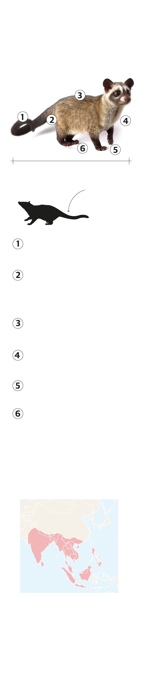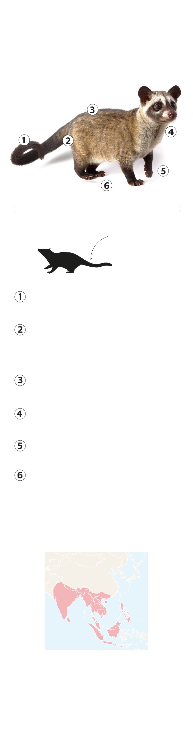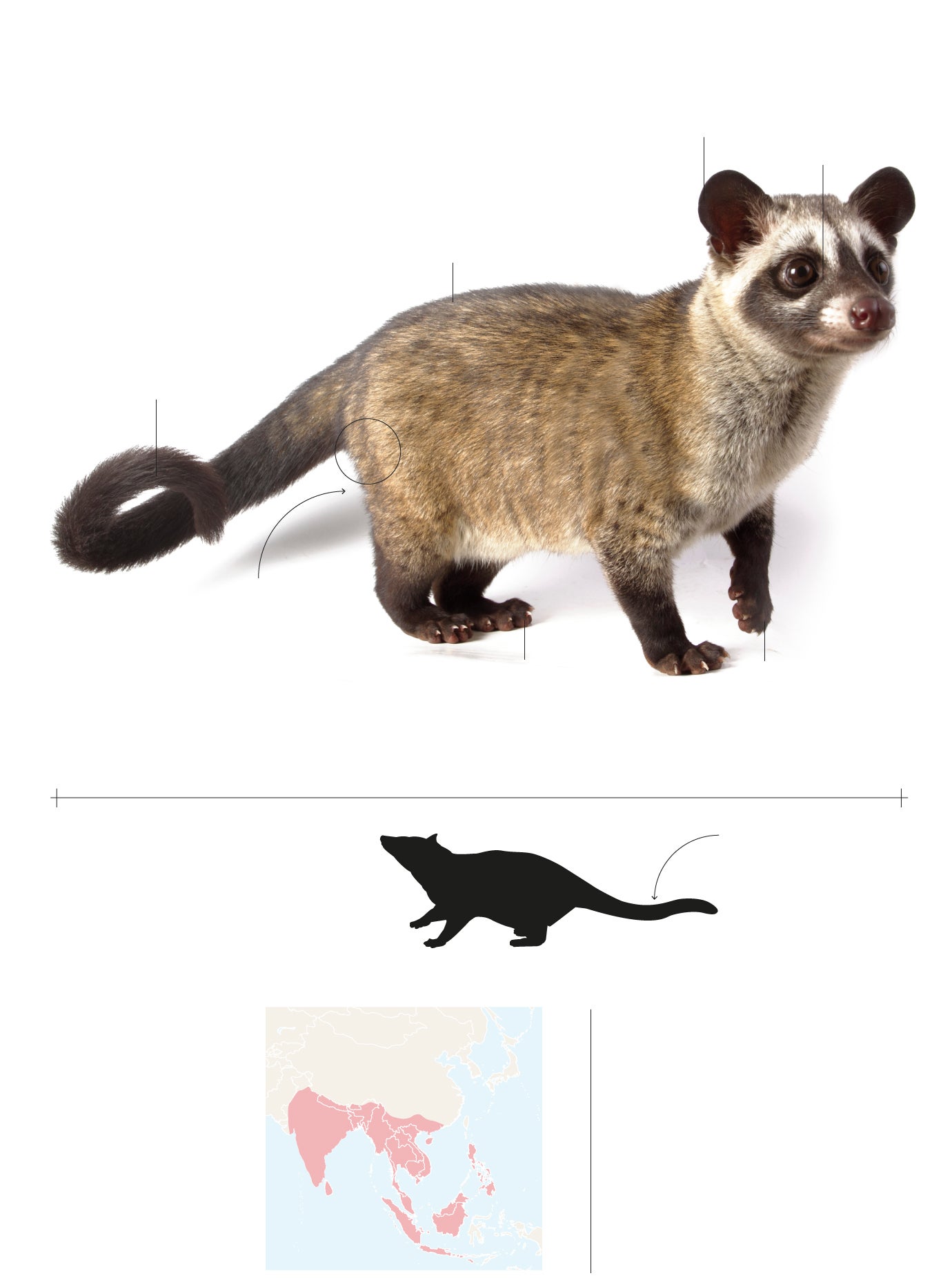 La civeta asiática de Palma o de las palmeras (Paradoxurus hermaphroditus) es un pequeño mamífero que vive en India, el sur de China e Indochina. Habita en bosques, aunque también se encuentra en parques y jardines, y su dieta se compone de frutas como el mango. También se alimenta de bayas o cerezas maduras de café, digiriendo la pulpa y excretando los granos enteros tras unas doce horas en su sistema digestivo.
