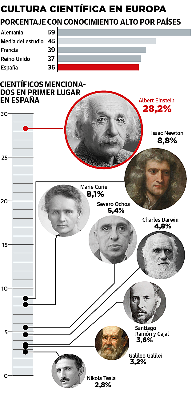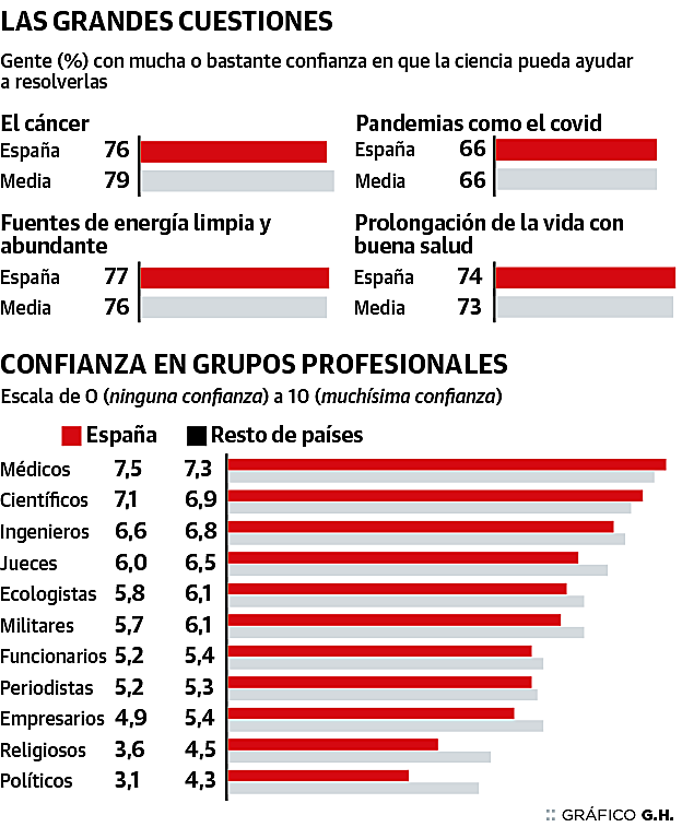 La población española otorga, por ejemplo, 6,7 puntos sobre diez a la idea de que la ciencia puede dar respuesta a los grandes problemas del siglo XXI, frente a los 6 puntos de media que conceden alemanes, británicos y franceses. La máxima de que 'gracias a la ciencia mejora continuamente la salud de las personas' obtiene en España una nota de 7,6 frente al 7,2 de los otros tres países. Desde el punto de vista cultural, en una escala de cero a diez, los españoles respaldan con un 7,5 el principio de que 'la ciencia nos revela aspectos fascinantes de la naturaleza', frente al 7,3 de Alemania, Francia y Reino Unido. En unos y otros países es «amplísimo», en cualquier caso, el consenso en torno al papel de la ciencia y la tecnología para el bienestar de la sociedad (7,6, aunque en este aspecto 'gana' Alemania, que le concede un 8).