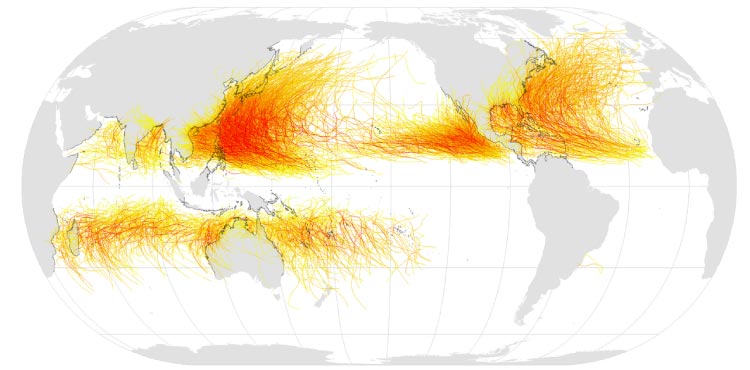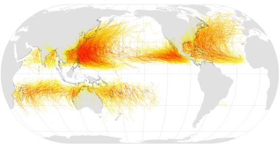 Los huracanes se registran normalmente entre el 1 de junio y el 30 de noviembre en el Atlántico. Y son exactamente el mismo fenómeno que los tifones del Pacífico y los ciclones del Índico: la diferencia radica en el origen. Los huracanes surgen en un área cercana a la costa africana en medio del Atlántico y se desplazan hacia el oeste. En su avance van ganando energía, robusteciéndose por así decirlo. Normalmente, tocan tierra por primera vez en el Caribe -lo hacen de manera violenta-, antes de seguir su desplazamiento hacia el norte e ir diluyéndose.