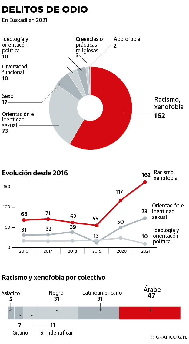 En 2021 se produjeron 277 delitos de odio en Euskadi, un 15% más que el año anterior (241). La mayor parte de ellos, seis de ... cada diez, tienen que ver con el racismo y la xenofobia, un 26% afectan a la orientación e identidad sexual, un 6% por el sexo, un 3,6% por la ideología política, el mismo porcentaje por discapacidad, un 1% por creencias religiosas y un 0,7% por aporofobia (repulsión a las personas pobres o desfavorecidas), tal y como refleja el informe que ha hecho público este lunes el vicelehendakari primero y consejero de Seguridad, Josu Erkoreka.