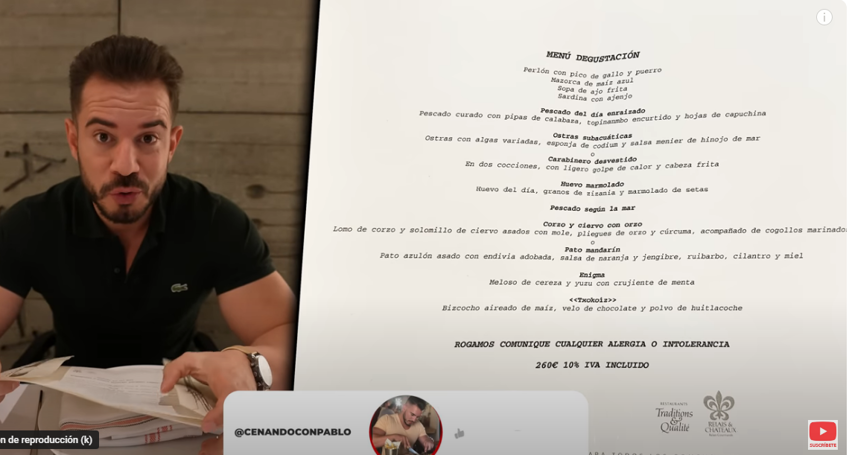 El influencer compartió su experiencia en Arzak en un vídeo de Youtube publicado en enero del año pasado. Como es habitual en sus publicaciones, reservó mesa y se presentó sin avisar de que se iba a grabar. Le sirvieron el menú degustación, que en su momento tenía un precio de 260 euros (IVA incluido) y constaba de 13 pases.
