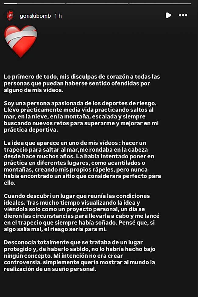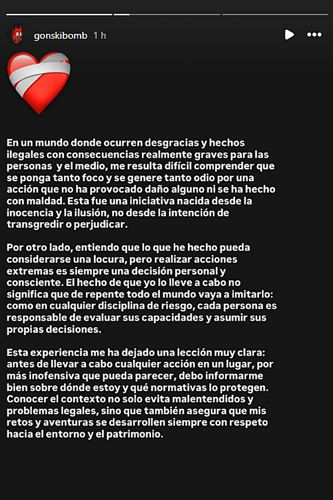 Eso sí, asegura que le resulta «difícil comprender que se ponga tanto foco y se genere tanto odio por una acción que no ha provocado daño alguno ni se ha hecho con maldad». «Esta fue una iniciativa nacida desde la inocencia y la ilusión, no desde la intención de transgredir o perjudicar». «Entiendo que lo que he hecho pueda considerarse una locura, pero realizar acciones extremas es siempre una decisión personal y consciente. El hecho de que yo lo lleve a cabo no significa que de repente todo el mundo vaya a imitarlo: como en cualquier disciplina de riesgo, cada persona es responsable de evaluar sus capacidades y asumir sus propias decisiones», avisa.