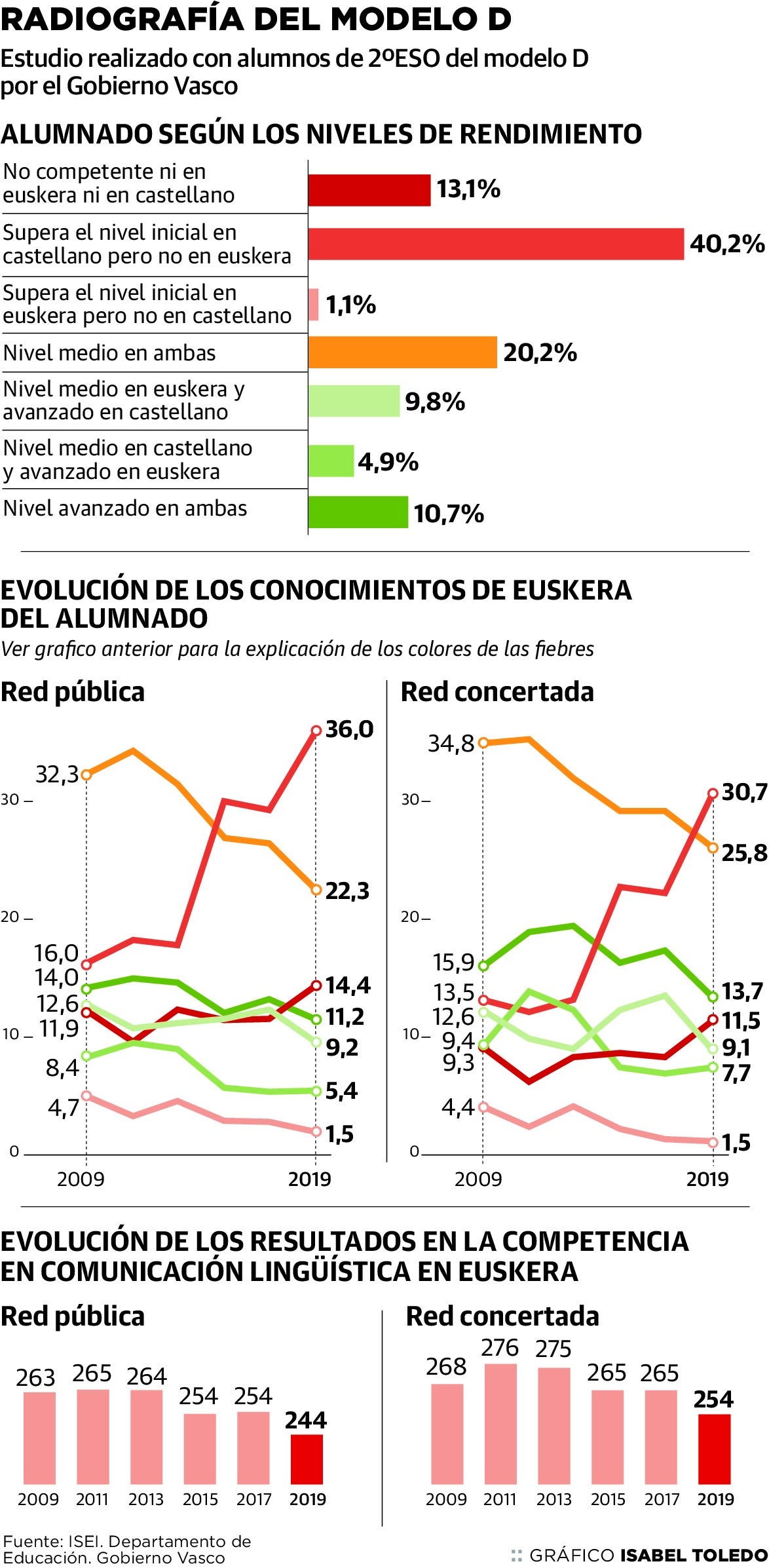 Las últimas evaluaciones a la enseñanza en Euskadi han puesto en alerta a la comunidad educativa ante la fuerte caída en el nivel de euskera ... entre los escolares. El modelo D, de inmersión lingüística y en el que estudia más del 70% del alumnado, no consigue alcanzar el objetivo del bilingüismo en más de la mitad de los estudiantes a los 14 años. Los resultados en comunicación lingüística en euskera son los peores en diez años. Y lo que empieza a ser ya preocupante: crece el número de chavales que no son competentes en ninguno de los dos idiomas oficiales.
