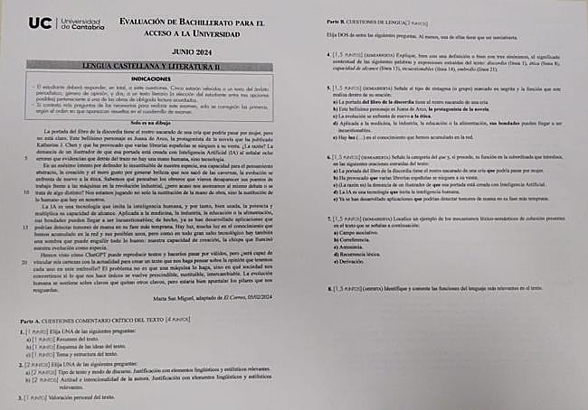 Los alumnos cántabros han tenido que analizar una versión algo modificada de un artículo publicado en la sección de Opinión de este periódico el pasado 5 de febrero y que lleva por título 'Solo es un dibujo'. Se trata de una reflexión sobre la inteligencia artificial y cómo su uso influirá en las creaciones humanas. Sobre él, los estudiantes han tenido que ir analizando la estructura y otros elementos lingüísticos o de estilo, así como realizar una valoración personal sobre el texto.