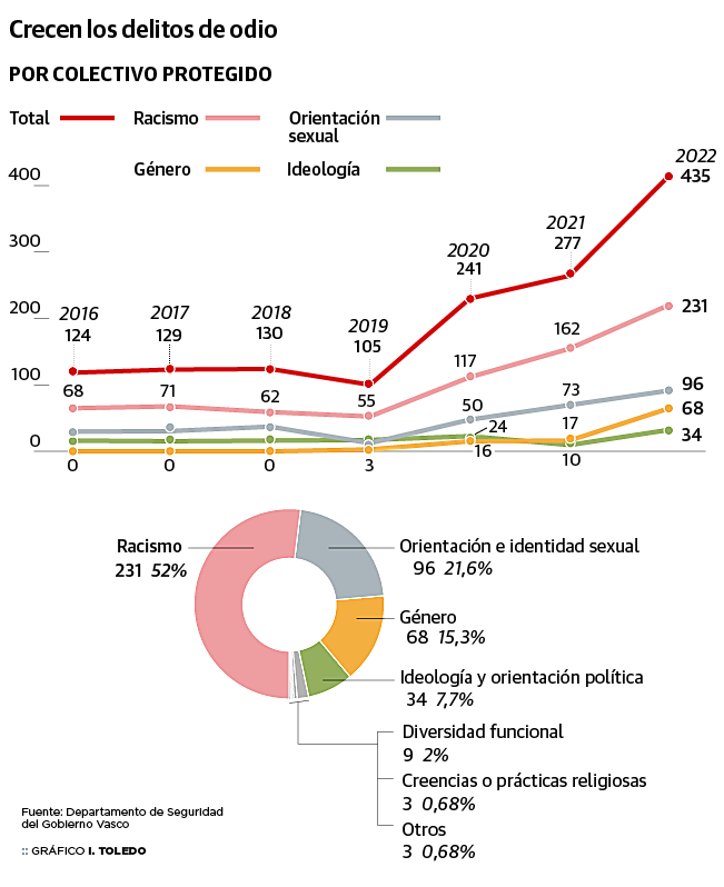 Los delitos de odio registrados en el País Vasco se dispararon en 2022 hasta los 435, un 57% más que en 2021 (277). Son más de uno al día, circunstancia que no se había producido hasta ahora desde que el Departamento de Seguridad comenzara en 2016 a elaborar informes específicos sobre este tipo de incidentes. Algo más de la mitad tuvieron que ver con el racismo y la xenofobia, dos de cada diez con la orientación o la identidad sexual y un 15,3% con el género, las tres principales condiciones -aunque no las únicas- por las que se producen estos episodios, según se desprende del análisis presentado este lunes en el Parlamento vasco por el consejero Josu Erkoreka.
