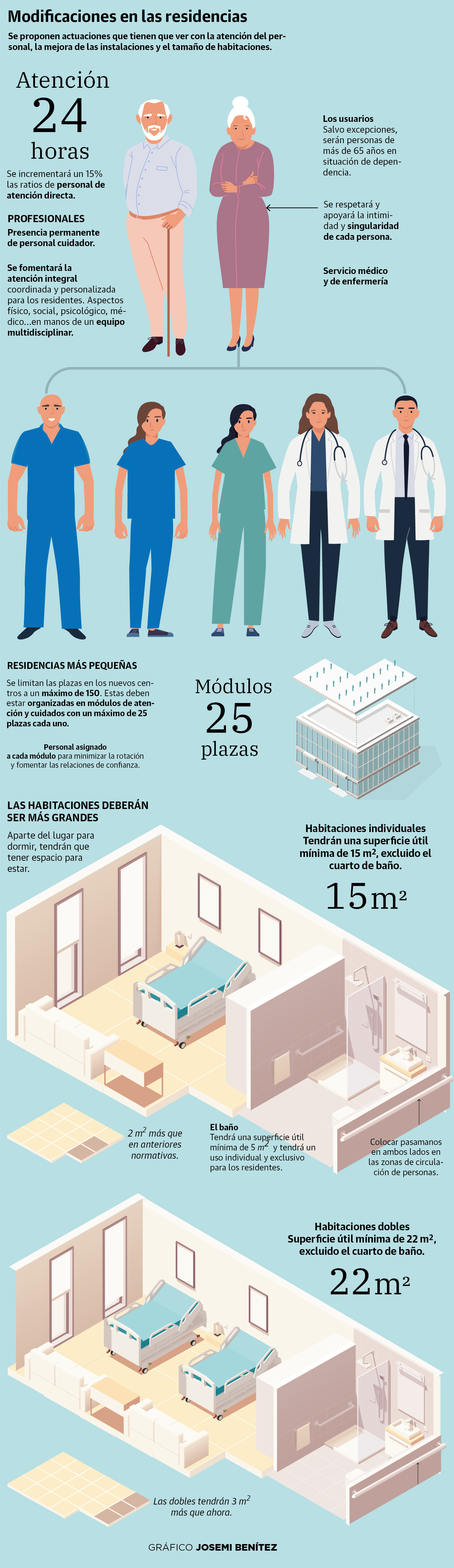 El documento reitera la apuesta por residencias más pequeñas y clarifica mejor el articulado del decreto de hace cuatro años. Las de nueva creación, como se aprobó entonces, no podrán superar las 150 plazas y deberán dividirse en módulos de atención de 25 personas, que «facilitan la convivencia de las personas mayores», independientemente del tamaño que tengan. Las patronales avisan desde hace tiempo que algunos de los centros existentes no podrán cumplir este requerimiento, aunque la memoria que acompaña a la modificación normativa advierte de que estas unidades están «en la filosofía del decreto», por lo que deberán «desarrollarse» de una u otra forma.