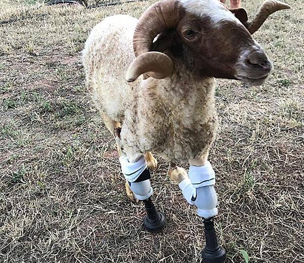 La vida del carnero 'Félix' es una historia de superación. Llegó gravemente herido por el ataque de unos perros al santuario El Hogar, en Tarragona. Una caída dejó sus patas delanteras inútiles. El verano pasado Derrick Campana estuvo en España y le fabricó unas prótesis. Es su caso más raro. «Sus patas estaban dobladas hacia atras, así que tuve que diseñar unas prótesis con resorte para que mantuviera el equilibrio y pudiera desenvolverse por la finca donde vive. Ahora anda perfectamente», explica.