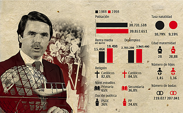 En 1988, el PSOE de Felipe González atravesaba el ecuador de su segundo mandato electoral, refrendado tras la mayoría absoluta de 1986 y a pesar de la dura reconversión industrial y unos problemas de desempleo casi intrínsecos a la economía española que derivaron en una huelga general ese mismo año el país afrontaba con optimismo el futuro, en el marco de la Comunidad Económica Europea desde dos años antes, instalado en la modernidad, con una democracia ya consolidada y con la vista puesta en el año 1992 y en los Juegos Olímpicos de Barcelona y la Exposición Universal de Sevilla, dos citas incomparables que trajeron consigo la primera línea del AVE entre Madrid y Sevilla y la transformación de la ciudad condal y en las que España mostró al mundo el enorme cambio experimentado en los años anteriores. El progresivo pero lento declive del 'felipismo', arrastrado por varios escándalos y casos de corrupción como el 'caso Filesa' y los años de plomo de la banda terrorista ETA con un goteo incesante de víctimas marcarán la transición hacia los años noventa, que supondrán la llegada al poder en 1993 del PP de José María Aznar, coincidiendo con una aguda crisis económica que dejó un aumento del desempleo al 24%, una caída de los beneficios y de la inversión de las empresas y una deuda pública disparada de casi 30 billones de pesetas. Son también años de nuevos progresos en el proceso de integración europea y en febrero de 1992 se firma el tratado de Maastricht, acuerdo fundacional de la moderna Unión Europea y primer paso hacia la llegada del euro, completada una década después en el grueso de estados comunitarios. En 1990, dos nuevos canales en abierto y uno de pago por visión revolucionan la televisión española. Antena3, Telecinco y Canal+ ponen punto y final al monopolio de TVE en la pequeña pantalla y traen consigo producciones que reúnen a millones de espectadores y alcanzan récords de audiencia hoy inimaginables, como las series 'Farmacia de guardia' (1991-1995) y 'Médico de familia' (1995-1999), convertidas en dos iconos de la cultura popular de la época, formatos como 'Las noticias del guiñol' y un nuevo concepto para las retransmisiones futbolísticas. Por José Manuel Andrés