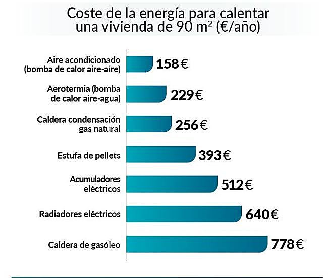 A esta tecnología le sigue de cerca la aerotermia, es decir el sistema bomba de calor aire-agua, que tendría un coste anual de 229 euros.