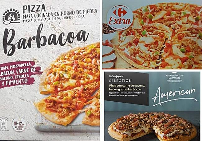 Le sigue la de Carrefour 'Extra bacon masa fina', que lleva pechuga de pollo asada en salsa, pimientos rojos y verdes, edam, mozzarella, bacon ahumado y carne de vacuno cocida. El bronce es para la American de El Corte Ingés, con carne, bacon y salsa barbacoa.