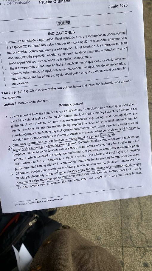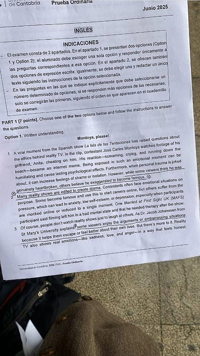 La prueba de Inglés en Cantabria incluye un texto de análisis de la telerrealidad de título inequívoco (a pesar del idioma): «Montoya, please!»