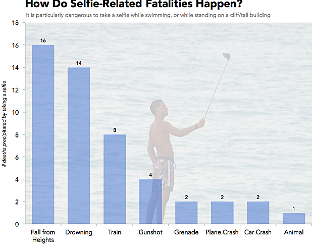 Para ello, rastrearon y analizaron las noticias sobre muertes por selfies que habían ocurrido en el mundo desde octubre de 2011 hasta noviembre de 2017. ¿El resultado? Como mínimo 259 personas en todo el mundo habían muerto mientras tomaban selfies en situaciones de peligro. En muchos de los casos no solo falleció la persona que llevaba el teléfono móvil en la mano, sino también sus acompañantes. En España perdieron la vida en estas circunstancias cuatro personas durante los seis años que comprende el estudio.
