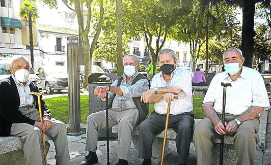 En los días que se celebran las fiestas de 'La velá' en la iglesia de Santiago de Don Benito, las mujeres guardan silencio ante el altar y cuidan de cambiar de flores y vestido a la patrona del pueblo. Afuera, sentados al sol en la Plaza de España, los hombres conversan. José Rodríguez, de 92 años; Santiago Ruiz, de 83; Jacinto García, de 82, y Gregorio Lozano, de 87, sostienen con sus anchas y curtidas manos sus bastones.