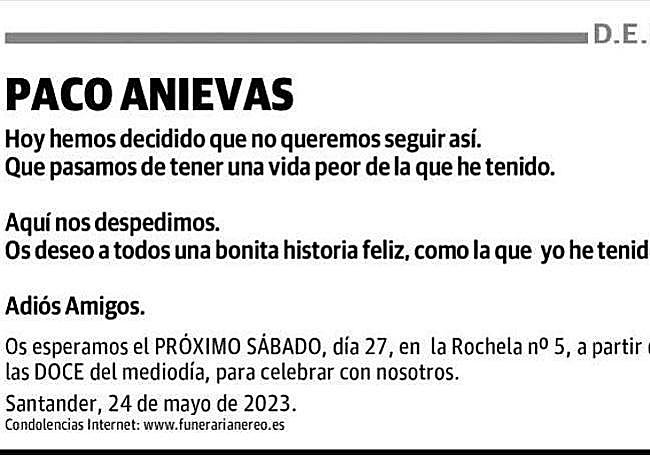 Entre todas las esquelas que publicó ayer 'El Diario Montañés', hubo una que llamó la atención. No precisamente por su tamaño, sino por el contenido. «Hoy hemos decidido que no queremos seguir así, que pasamos de tener una vida peor de la que he tenido», comienza la necrológica de Paco Anievas, un vecino de Cueto que falleció el martes a los 67 años tras las complicaciones derivadas de una neumonía ligada a un cáncer de pulmón con metástasis en los huesos, en las glándulas suprarrenales y en la médula. Un ejemplo de que la muerte no distingue, pero sí la forma de decir adiós. Estas breves reseñas que aparecen en los diarios suelen informar de los datos del sepelio. Pero hay quienes huyen de los convencionalismos.