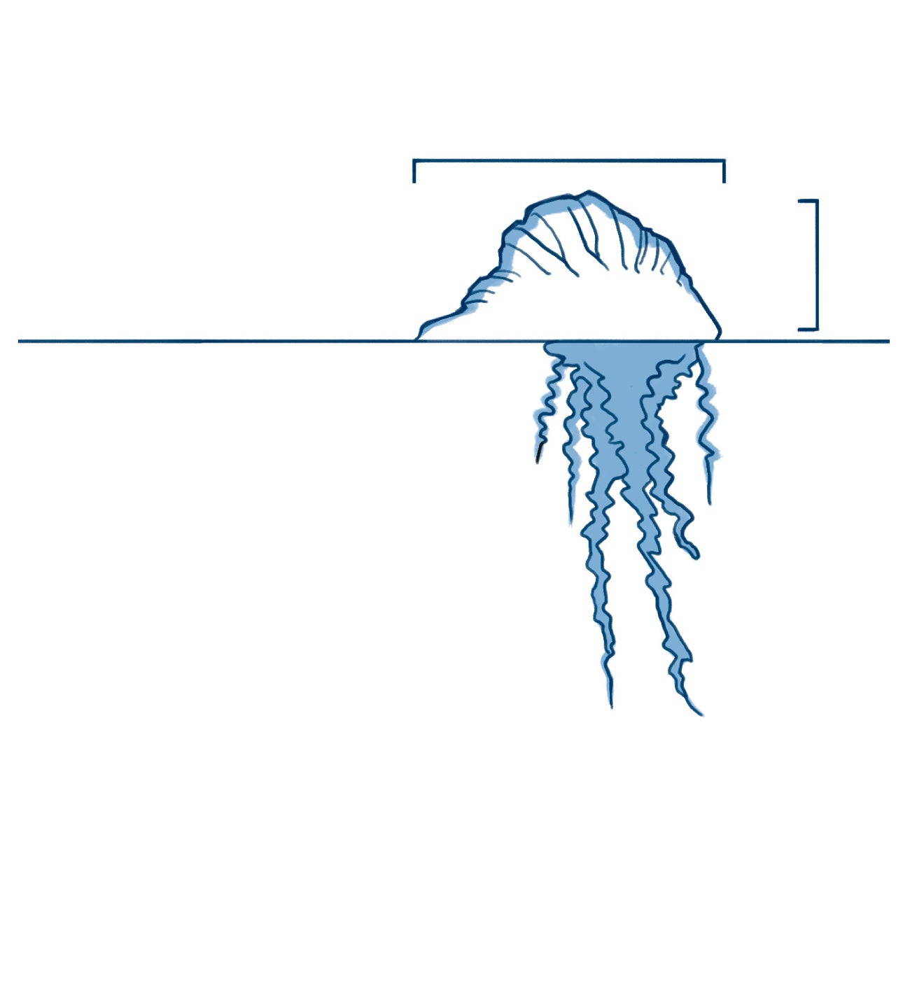Coloración Es azul plateado con tonos rojizos o violáceos, el resto de la colonia es de color púrpura o azulado. Los elementos defensivos se caracterizan por constituir largos filamentos cargados de células urticantes que pueden sobrepasar los veinte metros de longitud cuando están totalmente extendidos.