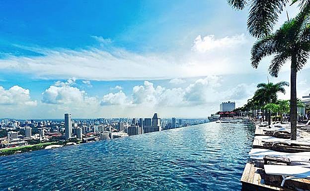 El Marina Bay Sands es un complejo de edificios de Singapur que acoge el casino independiente más costoso del mundo. Una terraza de 340 metros de largo une tres torres independientes de 55 plantas. En esta terraza se encuentra la piscina elevada más larga del mundo. Con un borde invisible y 150 metros de longitud uno puede pensar que se está bañando sostenido en el aire.