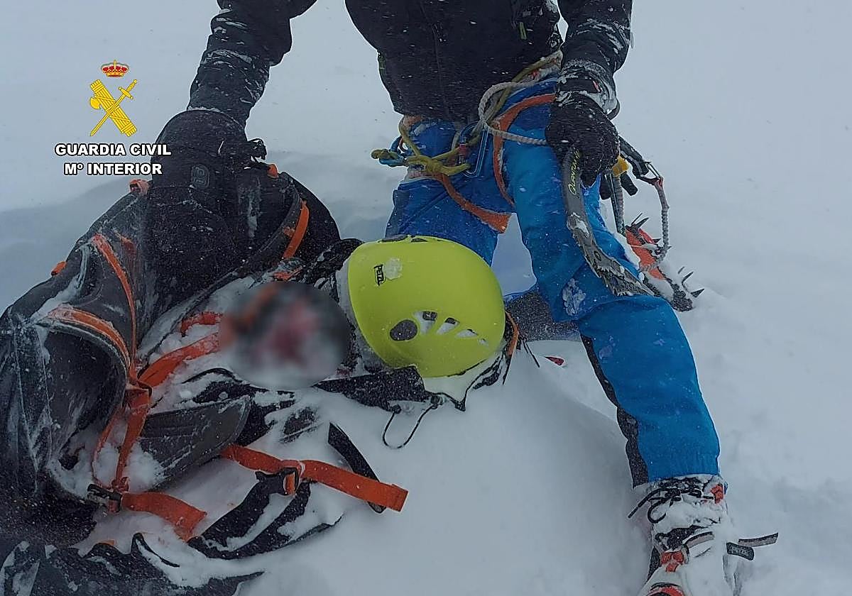 Ambos montañeros presentan hipotermia. Uno de ellos se encuentra semienterrado en nieve debido a la fuerte ventisca, consciente, sin poderse mover y con fuertes dolores, tras haber sufrido un deslizamiento de 200 metros debido al alud de nieve.