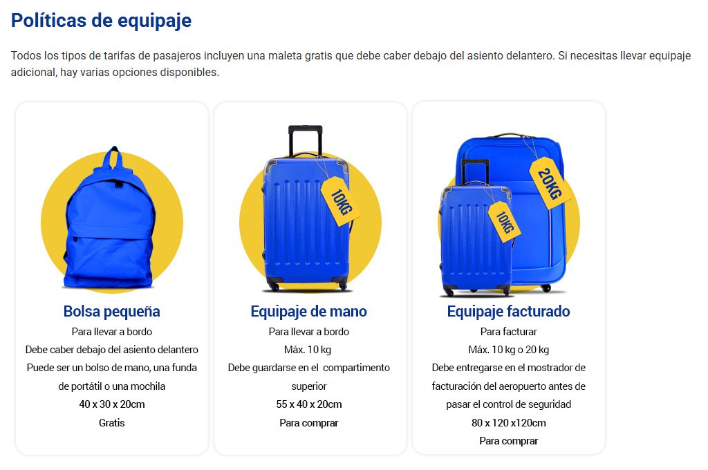 La compañía 'low cost' Ryanair ha aumentado el tamaño del equipaje gratuito. La bolsa de mano que se puede colocar debajo del asiento ha ganado algunos centímetros, ya que ha pasado de medir 40x25x20 a 40x30x20, un espacio que supone sumar 4 litros más. La aerolínea describe este accesorio como «bolsa pequeña para llevar a bordo, que debe caber debajo del asiento delantero; puede ser un bolso de mano, una funda de portátil o una mochila».