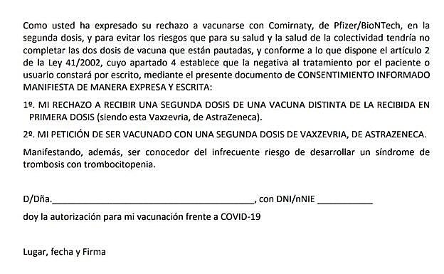 Las personas menores de 60 años vacunadas con AstraZeneca que elijan repetir fórmula para completar la pauta deberán rellenar un documento para manifestar de forma expresa su rechazo a recibir una segunda dosis de una marca diferente, en alusión a Pfizer. Asimismo, tendrán que expresar también por escrito su decisión de recibir de nuevo una inyección de AstraZeneca, «manifestando, además, ser conocedor del infrecuente riesgo de desarrollar un síndrome de trombosis con trombocitopenia».