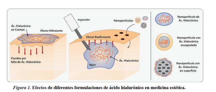 ¡Pero, ojo! Hay que tener en cuenta que la piel es la primera barrera de protección que tenemos contra el exterior y se podría comparar con un escurridor de pasta. Los «tallarines» de hialurónico son demasiado grandes y enmarañados como para atravesar los pequeños poros de «nuestro escurridor natural». Por tanto, el ácido hialurónico de la mayoría de las cremas antiedad quedará en la superficie, donde aportará hidratación y suavidad, pero no turgencia, para lo cual serían necesarias inyecciones o añadirlo en forma de partículas lo suficientemente pequeñas como para atravesar dichos poros, distinguiendo nanopartículas hechas de este compuesto, las que lo llevan en su superficie y las que lo encapsulan en su interior (Figura 1).
