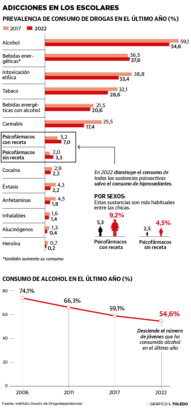El consumo de hipnosedantes entre los estudiantes de enseñanzas secundarias vascos ha crecido durante la pandemia. La encuesta que cada cinco años elabora el Instituto Deusto de Drogodependencias, en colaboración con el Departamento de Salud del Gobierno vasco, revela que un 7% de los adolescentes que completaron los cuestionarios –realizados entre octubre de 2021 y abril de 2022– aseguraron haber tomado psicofármacos con receta en el último año –en 2017 eran un 5,2%– y un 3,3% haberse automedicado con este tipo de sustancias –hace cinco años eran un 2%–.