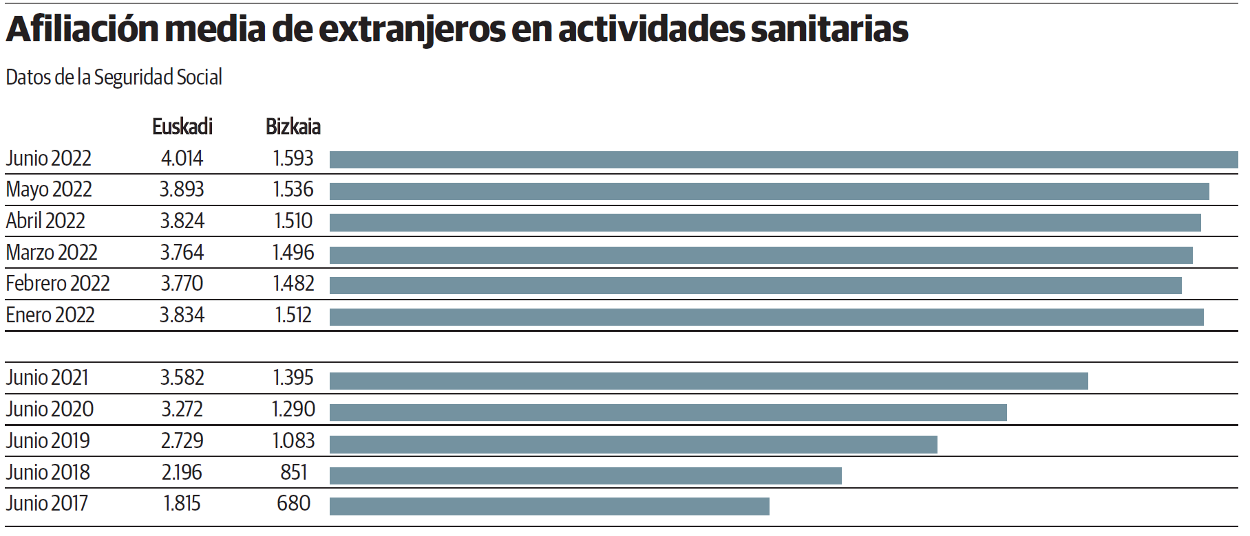 Este aumento de las incorporaciones de sanitarios extranjeros se ha visto reflejado de forma paralela en las tres provincias vascas. Tanto es así que Euskadi nunca había tenido tantos afiliados oriundos de otros países en el ámbito sociosanitario. En el último lustro, el País Vasco ha ganado 2.199 personas procedentes de otras naciones prestando este tipo de servicios y 1.285 respecto a hace tres años, momento en el que este tipo de contrataciones se vieron aceleradas. Sin ir más lejos, el pasado junio los sanitarios extranjeros suponían ya el 6% del total de afiliados registrados por la Seguridad Social en alta laboral de régimen general, en la que no se incluyen ni cuidadores no profesionales ni empleados del hogar.
