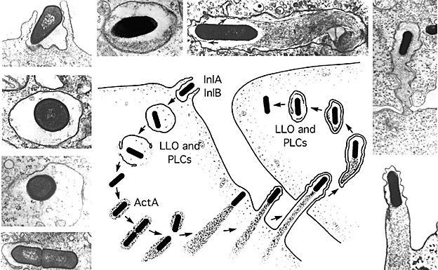 L. monocytogenes puede invadir las células. Para eso tiene una proteína en su superficie que se denomina internalina que, al unirse a otra proteína de la célula, promueve una cascada de reacciones entre la bacteria y la célula que acaba en la entrada del microorganismo. Se forma así una vacuola o fagosoma en el interior de la célula que contiene la bacteria en su interior.