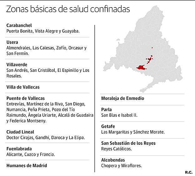 Los vecinos afectados pertenecen a 26 zonas básicas de la capital de España (repartidas en 6 distritos: Carabanchel, Usera, Villaverde, Villa de Vallecas, Puente de Vallecas y Ciudad Lineal) y a otras 11 zonas de otros 7 municipios (Fuenlabrada, Humanes, Moraleja de Enmedio, Parla, Getafe, San Sebastián de los Reyes y Alcobendas) . Esos barrios y pueblos, que representan el 13% de la población de la región, sin embargo suman casi el 25% de los contagios de toda la comunidad. Los barrios que van a ser aislados se mueven entre los 1.903 casos cada 100.000 habitantes (récord de todo Europa) de la zona sanitaria de Martínez de la Riva (en Puente de Vallecas) a los 1.006 de la zona de Miguel Severt en Carabanchel.