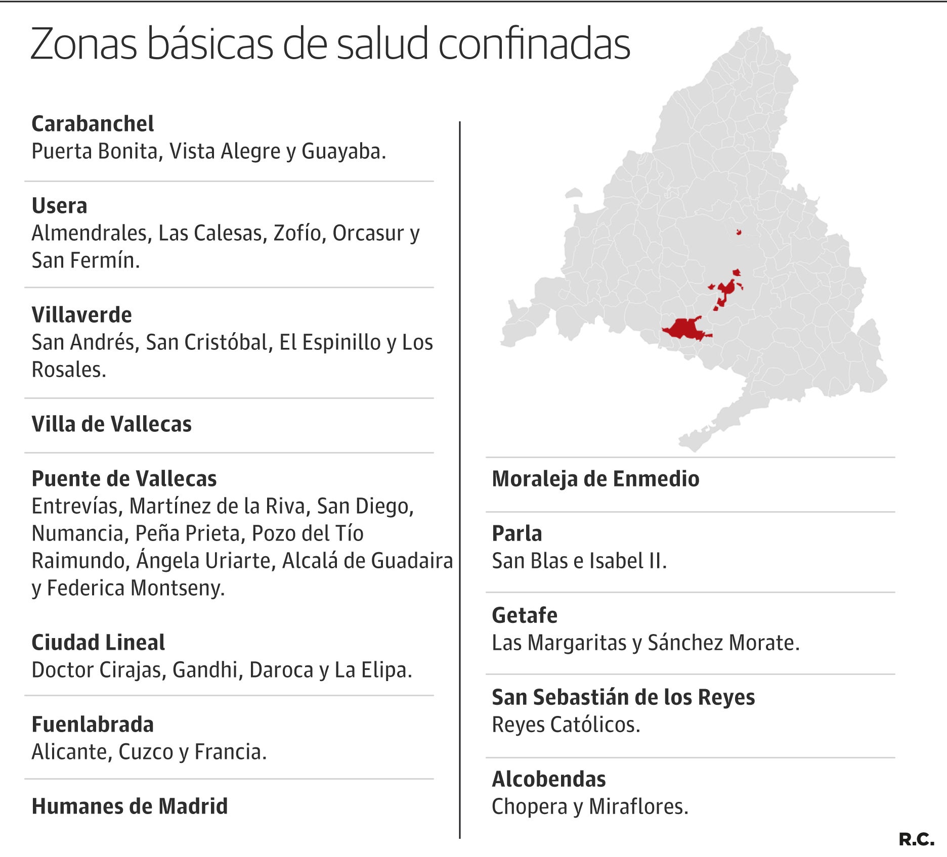 Los vecinos afectados pertenecen a 26 zonas básicas de la capital de España (repartidas en 6 distritos: Carabanchel, Usera, Villaverde, Villa de Vallecas, Puente de Vallecas y Ciudad Lineal) y a otras 11 zonas de otros 7 municipios (Fuenlabrada, Humanes, Moraleja de Enmedio, Parla, Getafe, San Sebastián de los Reyes y Alcobendas) . Esos barrios y pueblos, que representan el 13% de la población de la región, sin embargo suman casi el 25% de los contagios de toda la comunidad. Los barrios que van a ser aislados se mueven entre los 1.903 casos cada 100.000 habitantes (récord de todo Europa) de la zona sanitaria de Martínez de la Riva (en Puente de Vallecas) a los 1.006 de la zona de Miguel Severt en Carabanchel.