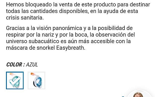 La cadena francesa -que cuenta con más de 160 tiendas en territorio español- ha bloqueado la venta de estas máscaras de buceo con snorkel para destinarlas a la crisis sanitaria, según informa la empresa en su página web. El bloqueo coincide en el tiempo en el que el interés ha llegado a España. Un grupo de médicos toledanos se movilizó por redes sociales y en unas horas consiguieron más de 40 máscaras de buceo de este modelo, según informa ABC. Recientemente el hospital HM Montepríncipe, en Boadilla (Madrid) así como el médico de esa institución Alberto Rubio, lanzaban un llamamiento para conseguir este tipo de máscaras de la cadena deportiva. Una convocatoria a la que se unió con fuerza la periodista Carme Chaparro, muy activa en redes sociales durante este confinamiento en el que comparte su preocupación por las consecuencias del coronavirus en la población.