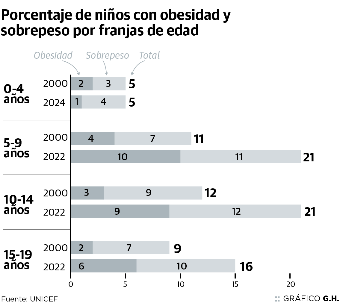 de los niños con sobrepeso entre los 5 y los 19 años presentan obesidad, lo que les expone a poder desarrollar algunas de las 200 enfermedades que se vinclulan con este fenómeno.