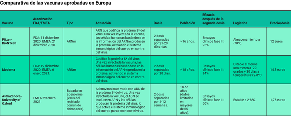 La vacuna de Oxford-AstraZeneca acaba de ser autorizada en Europa. Asimismo, otras vacunas, como la de Janssen/Johnson & Johnson, Sanofi/Pasteur/Glaxo Wellcome, CureVac y Novavax, cuya negociación está en curso, no han solicitado todavía autorización por la CE pero ya han firmado contrato de comercialización.