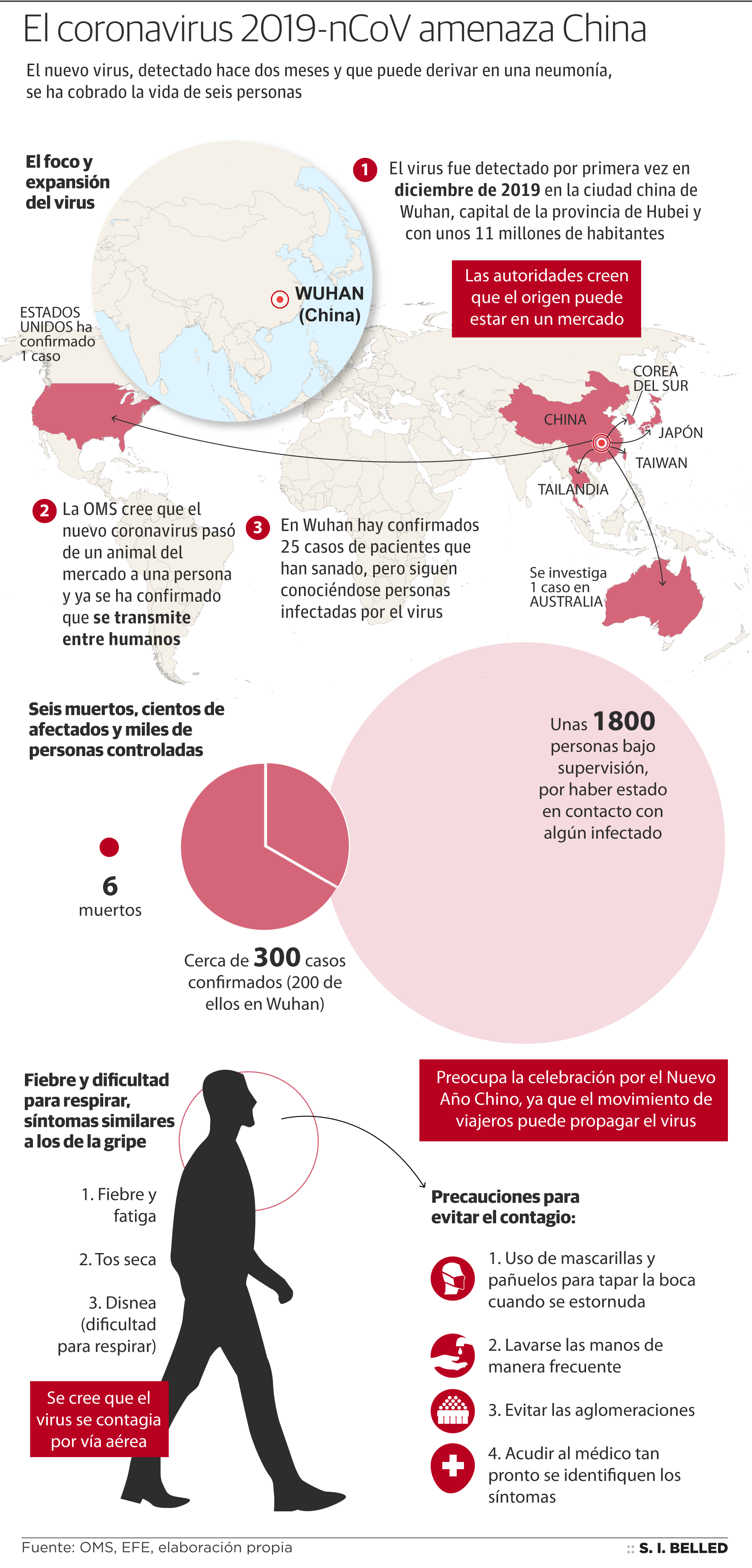 Un nuevo virus que se expande por Asia, desconocido hasta ahora para las autoridades sanitarias, ha obligado a la Organización Mundial de la Salud (OMS) a reunir su comité de emergencia para estudiar si declara la alerta sanitaria mundial. Se trata del C2019, un patógeno que causa síntomas similares a una gripe y que puede llegar a provocar un tipo de neumonía. Pertenece a la familia del Síndrome Respiratorio Agudo y Grave (SARS) pero de una cepa aún sin catalogar. El virus se ha cobrado seis vidas en China y hay constancia de 291 contagiados. Su alcance traspasó hace unos días as fronteras de China y ya hay casos en Japón, Corea del Sur, Tailandia y Australia. Pero en todos ellos los pacientes habían pasado por la ciudad china de Wuhan.