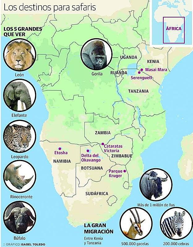 Un viaje de sensaciones «Nunca he visto un cliente defraudado. Siempre supera sus expectativas», asegura Javier Mencía, de Explora Safaris. El contacto con la naturaleza y la experiencia única de contemplar a los animales en su hábitat son inigualables, precisa. En Enkewa Camp, José Serrano se esfuerza por ofrecer un entorno que evoca los antiguos campamentos de cazadores, pero sin armas. La aproximación a las costumbres y tradiciones de los masai, puestas de sol espectaculares y viajes en globo para apreciar desde el cielo paisajes que quitan el aliento completan la oferta de actividades. Los depredadores están más activos al amanecer y al atardecer, por lo que las excursiones para verlos, en todoterreno con guía y rastreador, parten aún de noche.