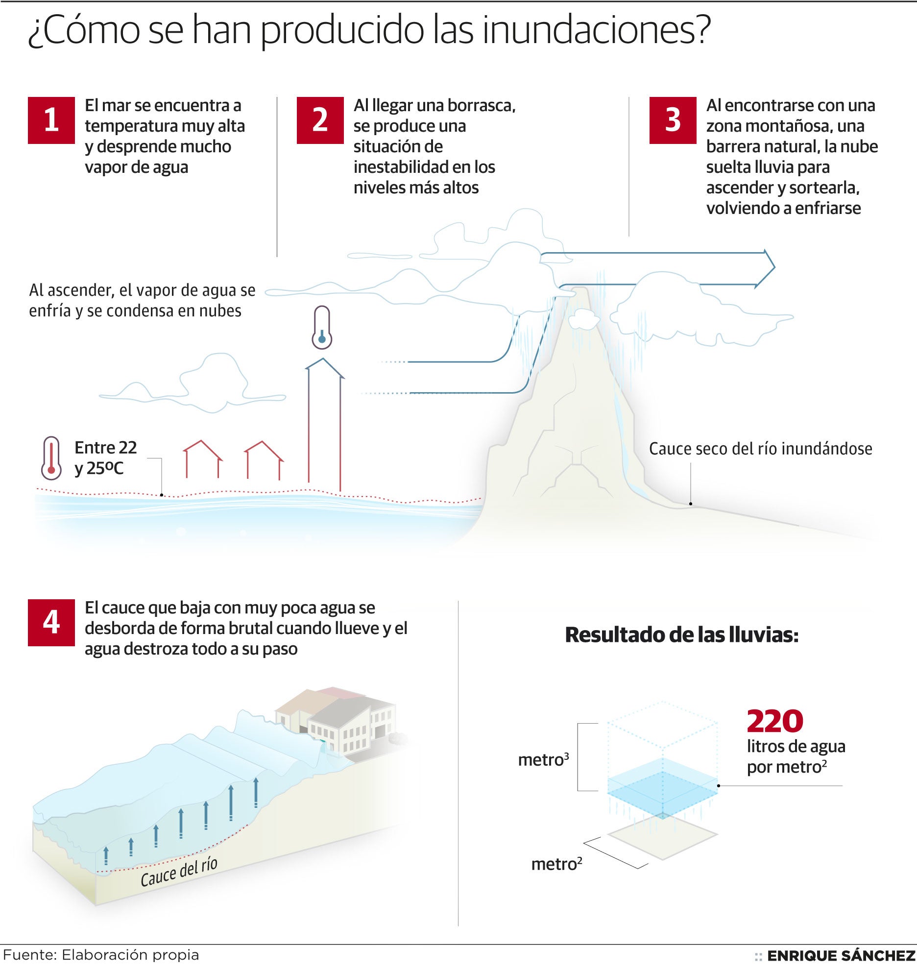 Aunque la zona del Mediterráneo español es muy propensa durante el comienzo del otoño a sufrir el fenómeno conocido como la gota fría (intensas precipitaciones provocadas por masas de aire frías sobre aguas cálidas), la violencia de este fenómeno hace preguntar a los expertos si tambien es fruto del cambio climático. «Estas precipitaciones son habituales en nuestro clima, sobre todo en las zonas costeras del Mediterráneo. El cambio climático favorece estas tormentas torrenciales porque ahora el mar está más cálido», añade López.