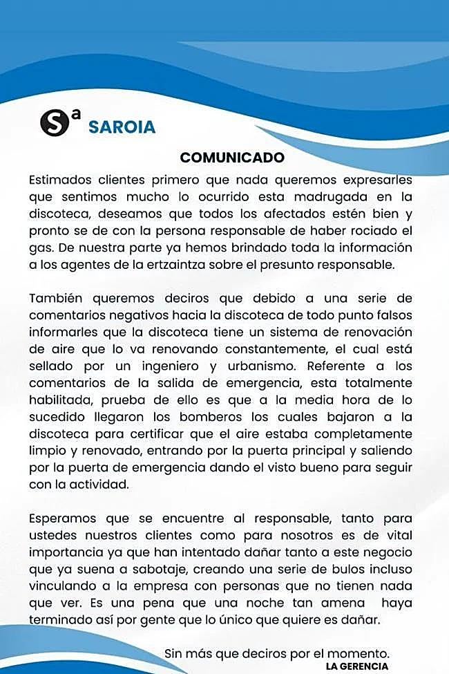 «Estimados clientes. Primero que nada queremos expresarles que sentimos mucho lo ocurrido esta madrugada en la discoteca. Deseamos que todos los afectados estén bien y pronto se dé con la persona responsable de haber rociado el gas. De nuestra parte ya hemos brindado toda la información a los agentes de la Ertzaintza sobre el presunto responsable», han señalado en la carta emitida a última hora de esta domingo.