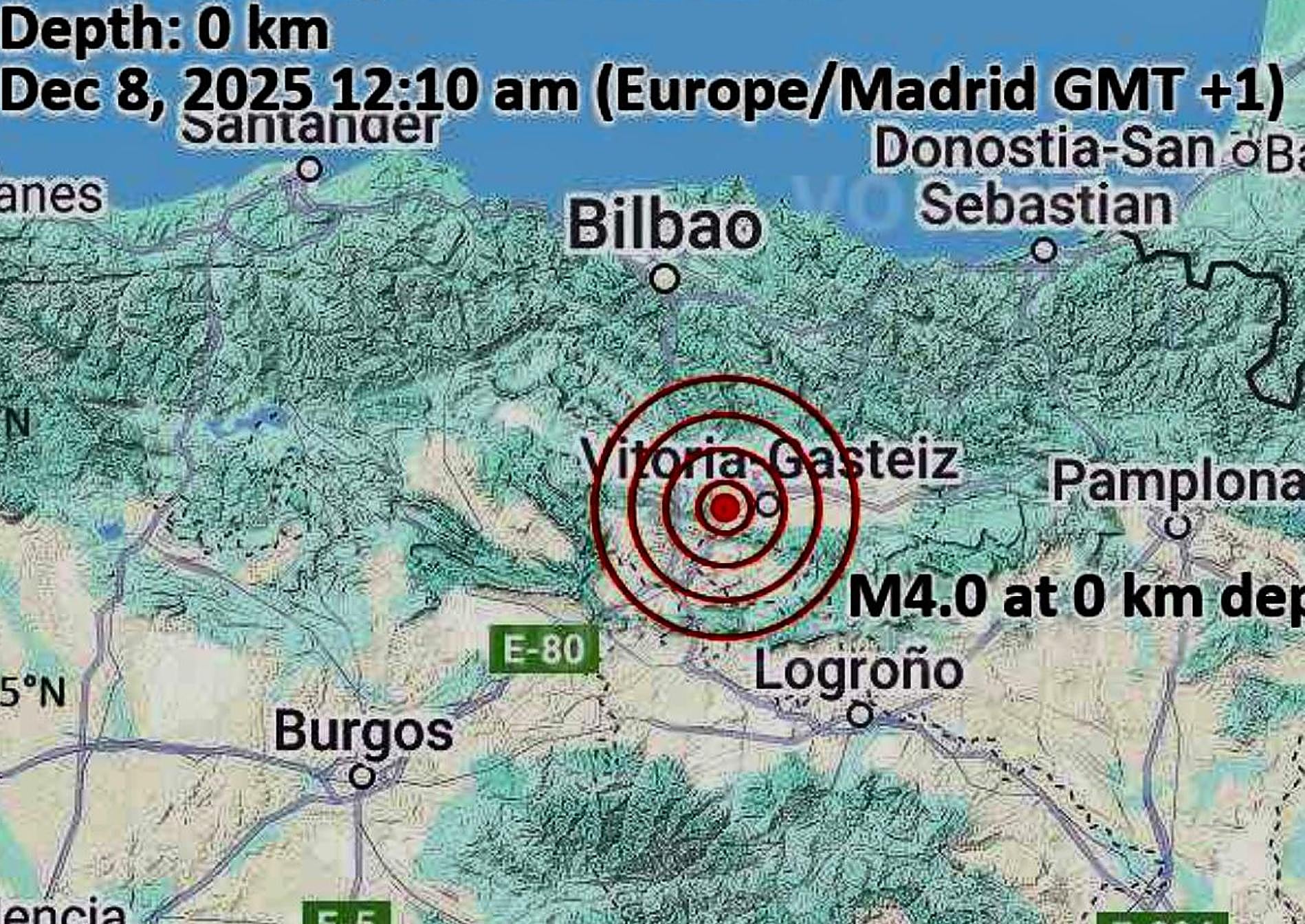 ⚠️ A las 00:10 de hoy, lunes 8 de diciembre, se ha registrado un terremoto de magnitud 4 con epicentro en Iruña de Oka /Nanclares que se ha percibido en Vitoria-Gasteiz y en numerosos municipios de Araba sin que consten daños a personas ni bienes. pic.twitter.com/rX5d0Nl06M