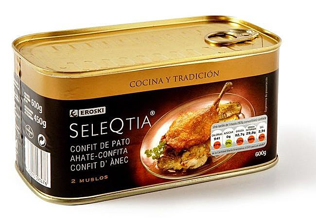 El confit de pato en lata es uno de los productos más esperados en Navidad. Se puede hornear y acompañar con una compota de manzanas o puré de patata. En Eroski, también bajo su gama gourmet Seleqtia, tiene un precio de 14,39 euros la lata, que contiene 600 gramos.