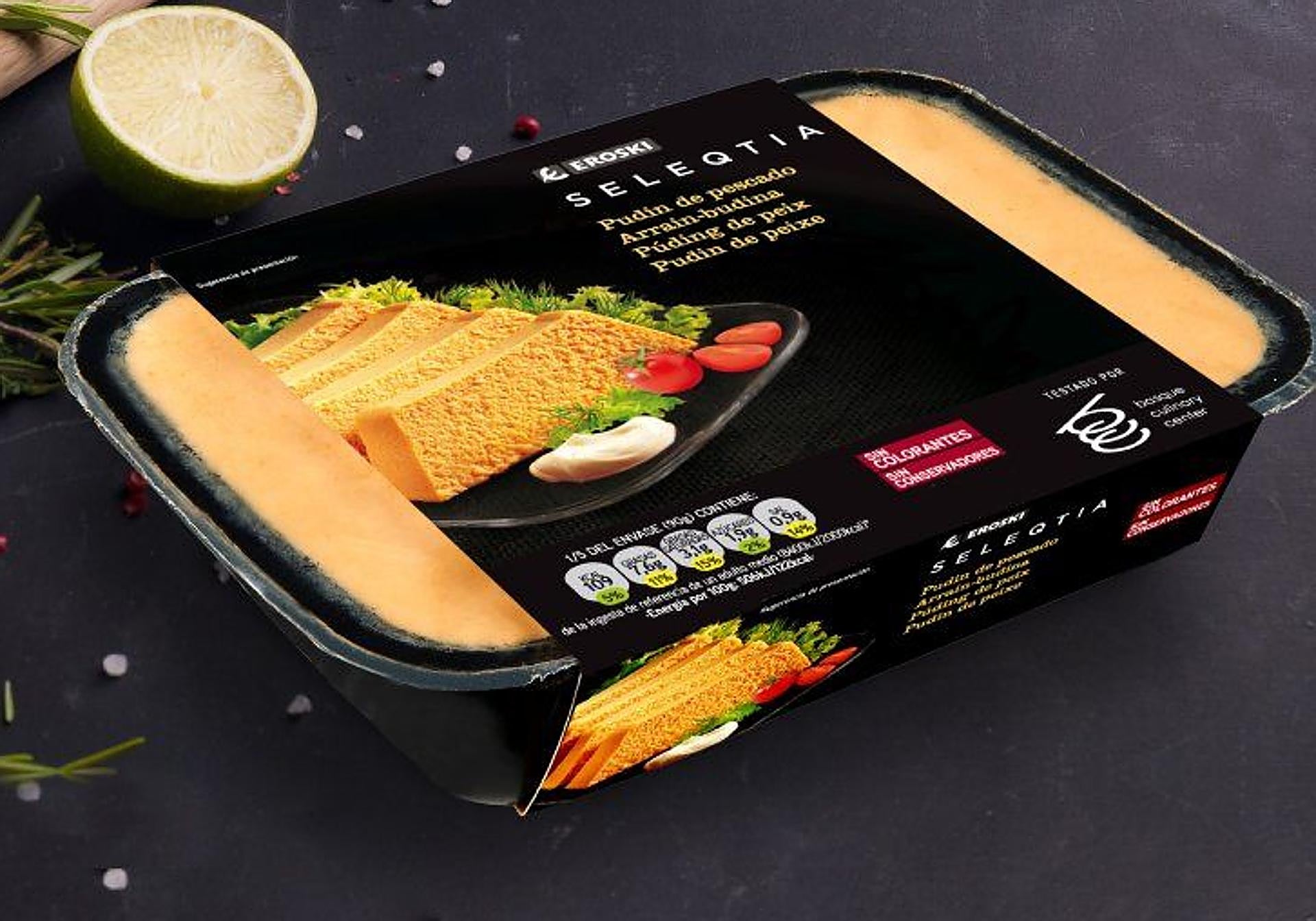 Otro de los platos que triunfan en las celebraciones es el pudin de pescado. En el caso de Eroski, se vende también dentro de la línea Seleqtia a un precio de 3,49 euros la bandeja de 400 gramos.