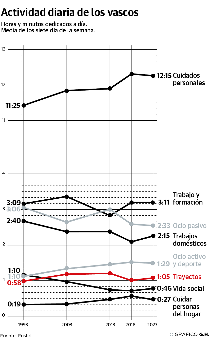 Muchos se preguntarán cómo es posible, quién tiene tanta libertad para hacer lo que quiera. Por eso es necesario aclarar que la Encuesta de Presupuesto de Tiempo del Eustat, de donde salen estos datos, dibuja la jornada promedio de la población mayor de 16 años, sin distinguir su situación personal o si es laborable o festivo. En un día tipo, si todos fuéramos idénticos, además de tener 4 horas y 48 minutos de ocio y vida social, emplearíamos 2 horas y 15 minutos en tareas del hogar, 27 en cuidados a familiares, 3 horas y 11 minutos en trabajo y formación, 1 hora y 5 minutos en trayectos y 12 horas y 15 minutos en cuidados personales, que incluyen dormir, alimentarse, asearse...