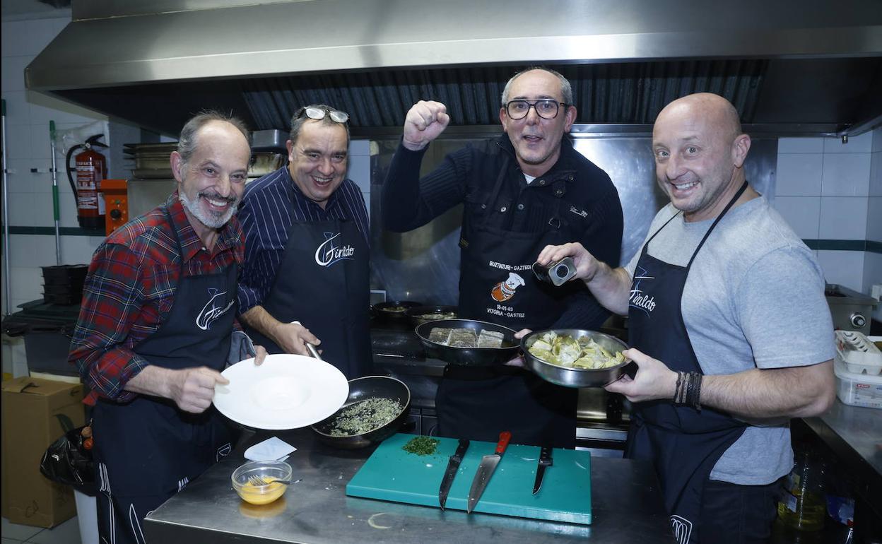 «Los hemos dejado día y medio a remojo». Uno no sabe si fue eso lo que les ablandó o su robusto aspecto. La esencia no se pierde, pese a que cada vez son menos los que han colgado la camiseta de rayas horizontales. Ahora la mayoría cruza la puerta con el delantal, un pasado que se nota en los fogones. El que tercia en ambos campos es Saldaña, que no duda a la hora de añadir la guarnición de la guasa. ¡Qué bien entra, oye! «¿Alguien quiere un poco más de sangre de Álava?», tanteaba el terreno, botella de vino en mano y con madera de pontífice