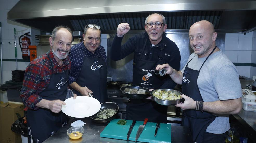 Son muy cucos estos del delantal con el escudo zurcido. Saben cuál debe ser el ataque para derretir al jurado solo con el primer bocado. Y así lo hicieron. A la mesa del concurso gastronómico organizado por ELCORREOy patrocionado por la Diputación de Álava llevaron un clásico de esta sociedad. «A la gente le gusta, es un éxito. Lo hemos preparado varias veces y como gusta, no vamos a hacer cambios», comentaba Roberto Cruz, dando forma al ataque, encabezado por el bacalao de Giraldo y acompañado con alcachofas y hongos. El encargado de culminar el ataque fue Tomás Rojo.