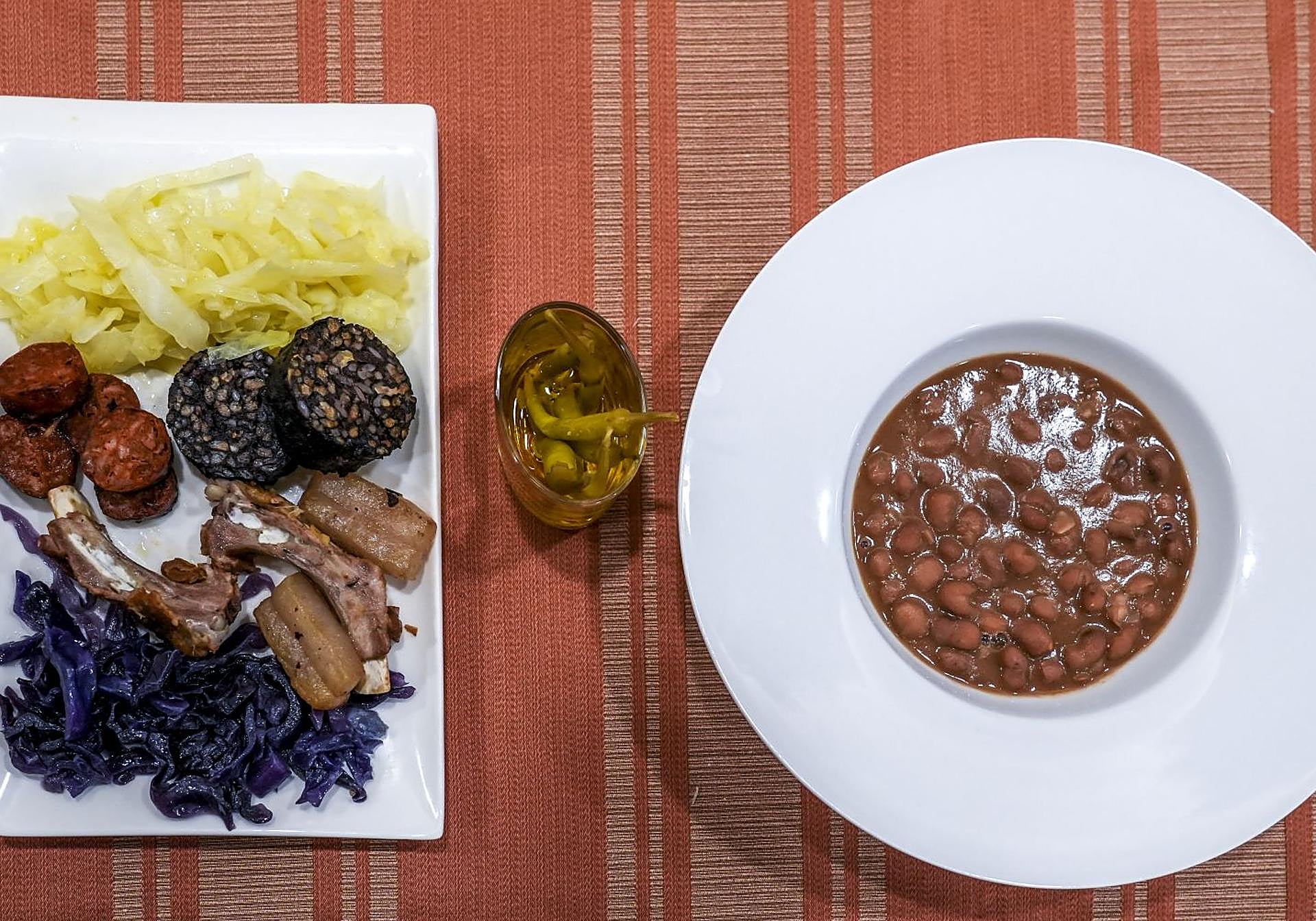 Costilla: después de cocer con las verduras la ponemos en la sartén para sellar y trocear. El chorizo: calentar en la sarten y trocear. Tocino ibérico: lo ponemos en el horno durante 2 horas a baja temperatura. Después troceamos. Morcilla: cocemos durante 10 minutos con agua. Pelamos la morcilla y la cortamos en rodajas, después pasamos por la sartén. Berza: cortamos en juliana. En una cazuela llena de agua cuando este hirviendo vertemos la berza y la mantenemos hirviendo durante 5 minutos. Dejamos escurrir. Después, rehogamos en una sartén con un poquito de aceite. Lombarda: cortamos en juliana. En una cazuela llena de agua, cuando esté hirviendo vertemos la lombarda y la mantenemos hirviendo durante 8 minutos. Dejamos escurrir. Después rehogamos en una sartén con un poquito de aceite.Todo ellos presentamos en una bandeja. Piparras con sal y aceite de acompañamiento.