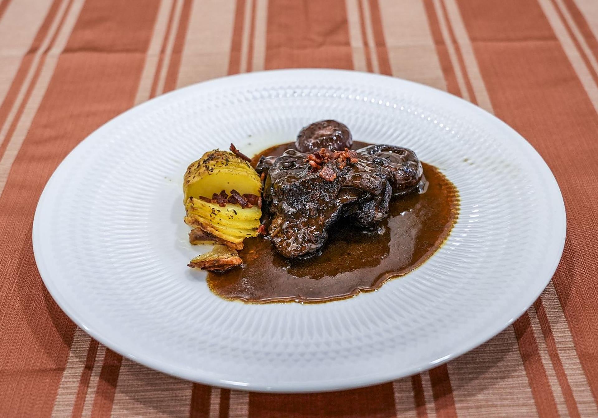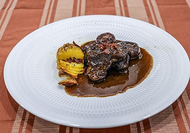 Pollo Lumagorri al vino tinto con guarnición de patata Hasselback