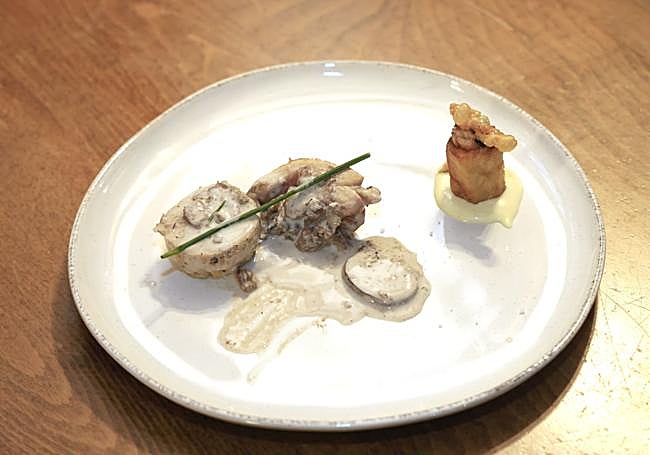 Pasadas doce horas hacemos rulos con la pechuga y el tartar, embridamos y llevamos a la nevera. En paralelo, preparamos un concentrado de caldo con carcasa y verduras. Hacemos unos cilindros de patata que confitamos y vamos a rellenar con una farsa de pollo que coronamos con un crujiente de pollo. Para el roti, marcamos los rulos del roti de forma intensa en la plancha. Retiramos, desembridamos cortamos y salseamos con el desglasado del marcado del roti+el caldo profundo+oloroso+crema soja y con los portobelos.