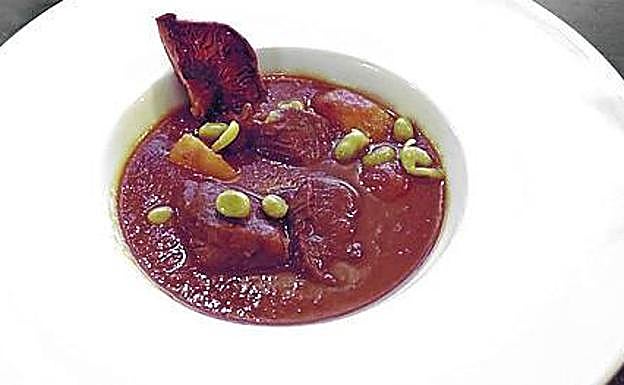 Ingredientes para cuatro personas: Una cebolla roja, otra blanca, un puerro, dos dientes de ajo, una zanahoria, medio pimiento verde, otro medio rojo, nabo blanco, 200 gramos de tomate frito, dos cucharadas de pulpa de pimiento choricero, un kilo de patatas, 750 gramos de solomillo de pulmón, 1,5 litro de caldo blanco, una copa de Brandy, habitas tiernas y níscalos.