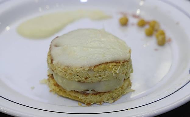 A continuación, se coloca el timbal en un lado del plato y se adorna con unos garbanzos fritos que se reservaron de la primera elaboración y un poco de pimentón.