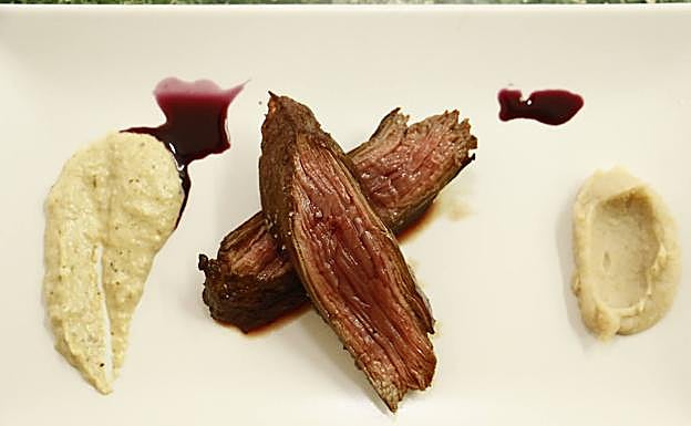 Presentación: Cortamos la carne en filetes y emplatamos. A un lado, la salsa de boletus y al otro, el puré de castañas. Decoramos con una reducción de vino tinto de Rioja Alavesa. .